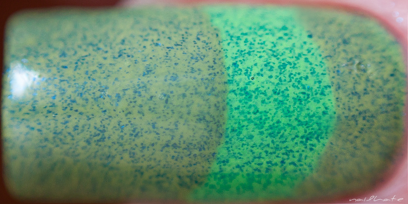 Самое забавное, что глаз воспринимает цвет "в общем", уже с синими крапинками, которые неизбежно визуально меняют оттенок лака)) Сложно описать сам цвет базы, разбеленно-светло-зелено-травяной) А синий глиттер - дает оттенок изумруда)